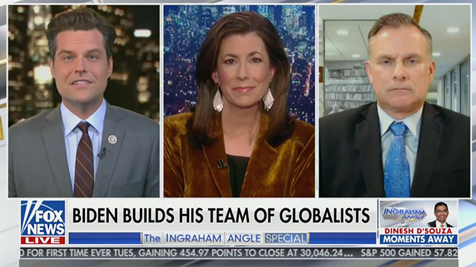 Tammy Bruce, president of Independent Women’s Voice, guest hosts The Ingraham Angle. She’s joined by Rep. Matt Gaetz (R-FL) is discuss Biden’s cabinet picks and tone they set for the administration.